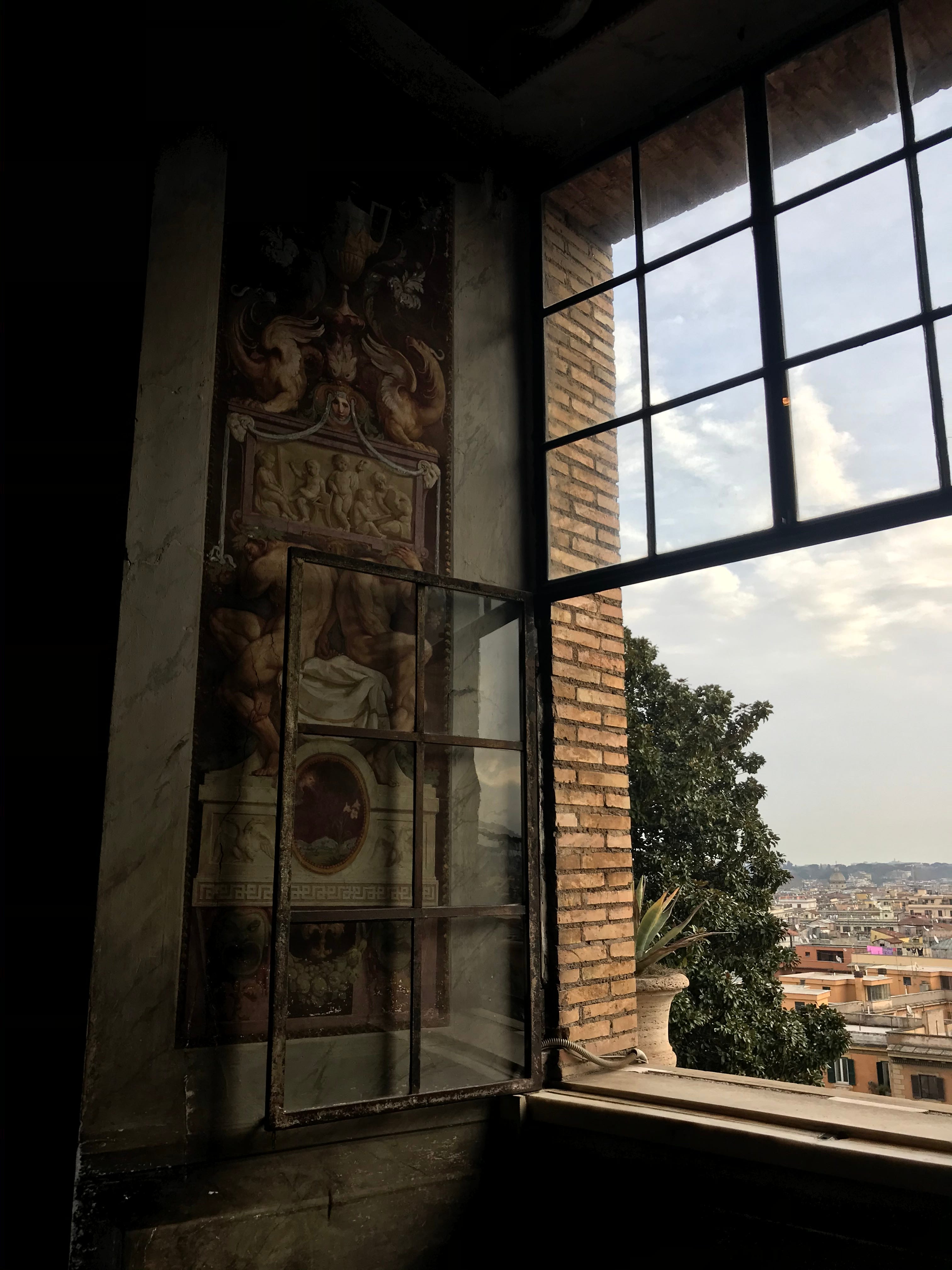 I took the photo of the room in the farmhouse and the window in the Vatican because I saw something beautiful that caught my eye. It is that simple. I am constantly doing this and 99% of the time nothing comes of those photos, but it is worth it for that 1% that do. That trip in 2022 was the first time I had traveled on my own, had taken a plane by myself and the first time I stepped out of my comfort zone and did something for myself. In painting that room I captured the moment in time that I was growing as a person. The stars on the window and the little figurine hanging from the shelf are whimsical and childish and yet my friend and I were traveling in a different country on our own for the first time staying with two strangers we had never met. We were practically watching ourselves grow up in real time. This painting, as a happy accident, represents that gradual shift from childhood to adulthood that I think is our 20’s. An art professor might love the idea of the blue and orange paint melting off the walls as a representation of a loss of innocence, but this is only the type of analysis you can do after a painting is finished. The title No Rushing in Heaven of course comes from the quote by the chef and it really does encapsulate the meaning of my time on the farm. It is important to me, though, that the title of my artwork adds to or is an extension of the art itself. I want my paintings to capture the viewer just by looking at them, but I also want the title to grab your attention as well. I really think No Rushing in Heaven says so much more than Tuscany Interior would.