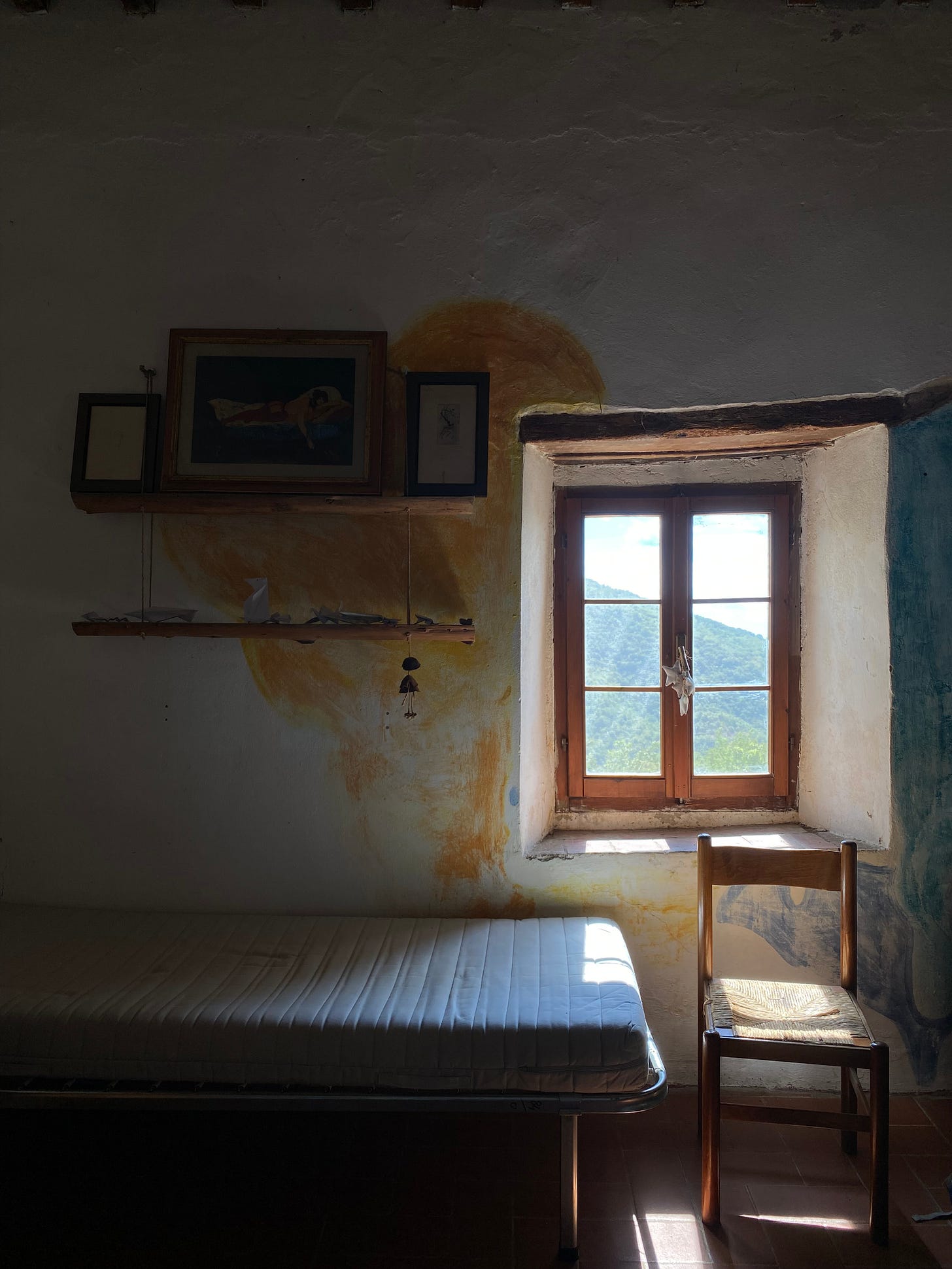During the day my friend and I would sit outside under the shade of the cyprus trees and draw or embroider. One afternoon the chef came out to ask us to pick blackberries for a tart he was making for dessert and we immediately jumped up and gathered our things to go do this. He waved us off and said there was no rush and that he just needed them before dinner. As he walked back into the house he said “There's no rushing in heaven” and so I finished the watercolor painting I had been doing in my sketchbook and wrote that quote on the page. After a week of slowing down and relaxing in the mountains with one of the best views of my life, I had learned more about myself than I had in a long time. I had not realized that I was changing until I had left and could reflect back on that time. When I took that photo of my room in the farmhouse I did not take it with the intention of turning it into a painting. If I remember correctly I just saw how beautiful the lighting was and I asked my friend to wait before she walked into the room so I could snap the picture. I am certainly drawn to interiors more than something like a landscape because of the meaning and character they hold. That farm house had so much character to it with the blue and orange paint on the walls and the handmade shelves holding origami and other trinkets. Even with the bare mattress on the metal frame and the stiff wood and wicker chair there is something so inviting about that space.