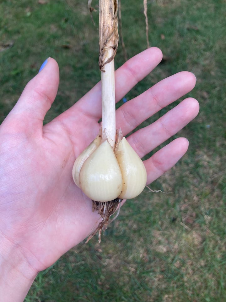 This year I attempted a new crop, garlic. I started the process in Fall of 2023. I was working at Tangerini’s Farm; this late in the fall the shifts lasted all day, open to close with one employee running the farm stand. It was lonely and very quiet. Only a few regulars. I was cold and drank too many lattes while listening to The Cranberries, Everyone Else Is Doing It, So Why Can’t We? on repeat. Most of my time was spent shucking seed garlic and finding new ways to tidy up produce that was already tidy and organized. I was contemplating how I could arrange the bread in a way that was inviting but didn’t pull focus from the corn when a woman ran into the farm stand.