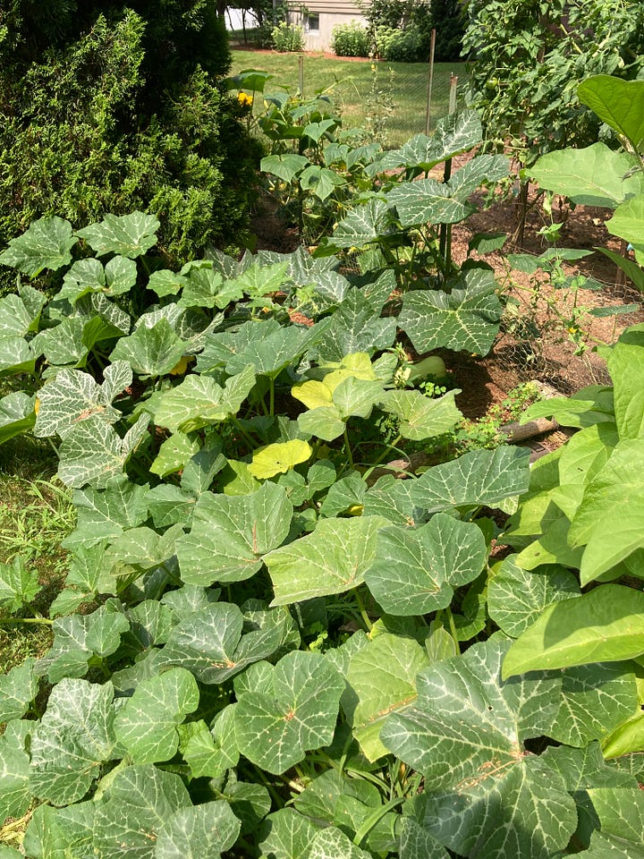 My final point of excitement comes from my volunteer butternut squash! Every season I fill my garden with compost and the result is a few volunteer plants. Both this season and last, has brought forth volunteer butternut squash. I never plant the seeds but rather the seeds have volunteered themselves for my garden via the compost. Last year it was a real surprise that resulted in a crop of butternut squash that lasted us through the winter and into the early spring. This year when I saw the sprouts germinating, I was enthused! The crop so far is progressing wonderfully and I expect a similar bounty that will last us into the winter.